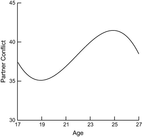 - 生命阶段:如下图所示,统计显示爱侣的冲突从18、19到25岁左右在稳步增加,但此后就平缓下来。从青少年步入成年期,在25岁左右人们(美国纽约州的一个纵向研究)通常会大学毕业、确立持久的爱情关系、并开始进入新的职业生涯,这些生活体验的变化常与冲突的增加有关系。亲密关系在老年期变得更为平静,60多岁的老夫老妻通常在许多敏感问题(如娱乐和宗教信仰)上比中年夫妻分歧更少,而中年夫妻最大的两个冲突来源是孩子和金钱。