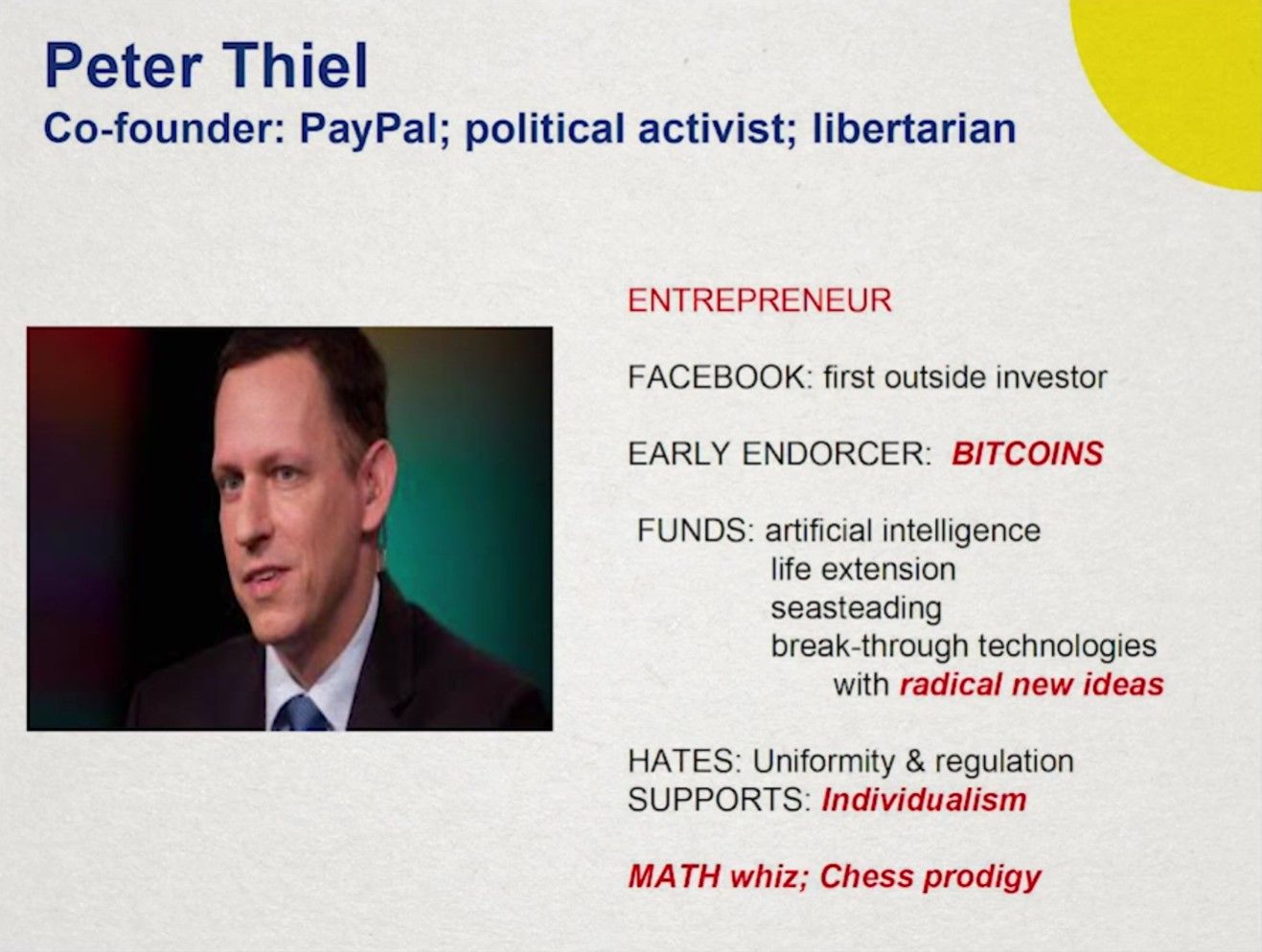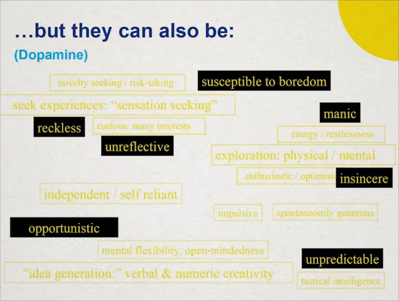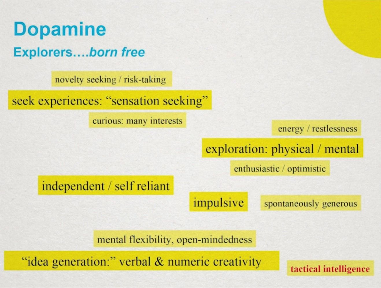 如果你是多巴胺系统反应活跃的探索者,那么你更倾向于寻求新奇和冒险,拥有很多的兴趣点。这类人最有可能去上大学,赚最多的钱也赔最多的钱。他们会同时在身心两个方面进行探索(比如积极参加线下会议讲座)。他们更乐观主义、独立自主、冲动、看向外部世界而不是自省。他们最明显的特征是头脑灵活灵感迸发,充满创造力。典型的例子有Richard Branson、朗朗、Peter Thiel等。