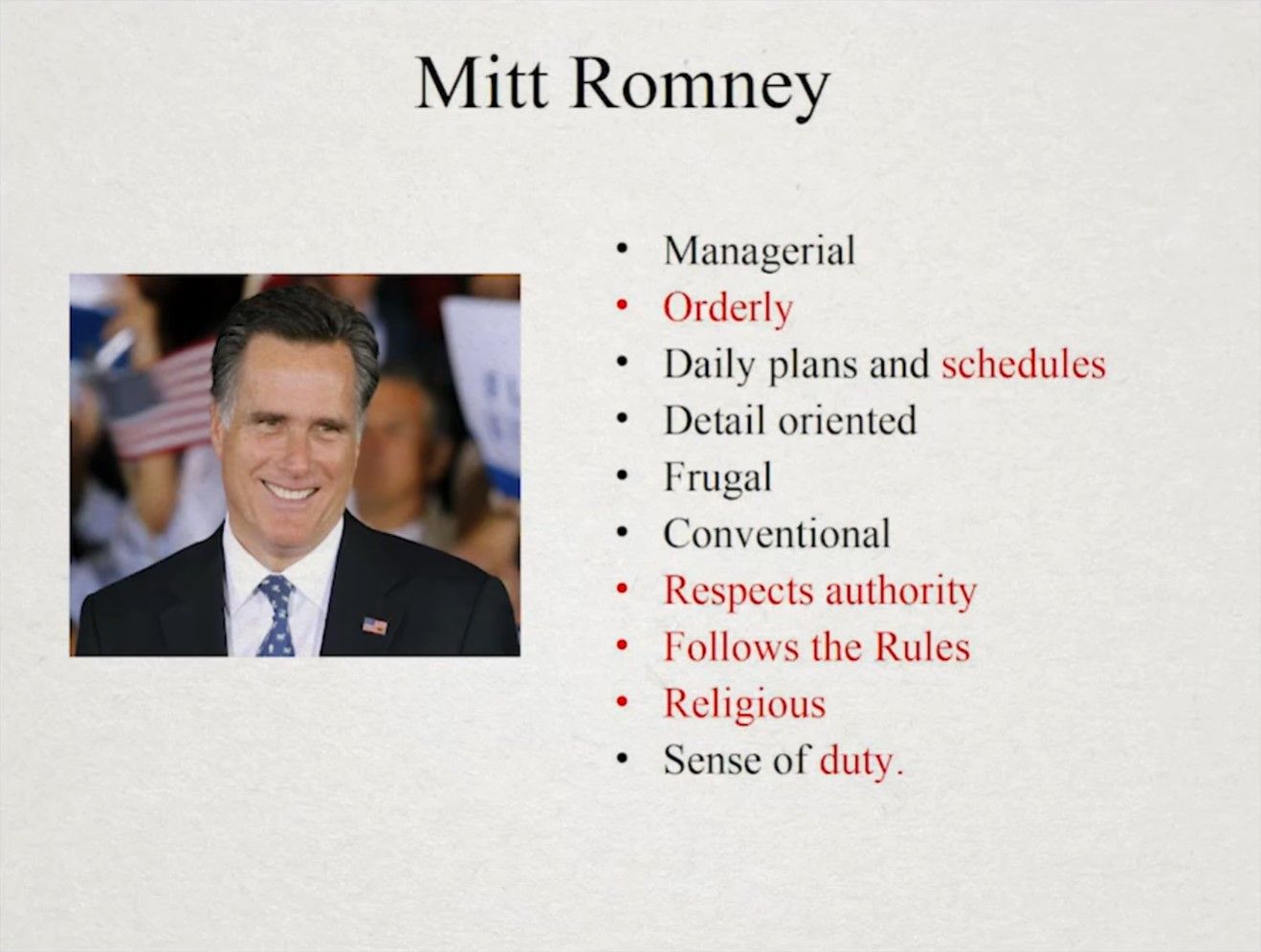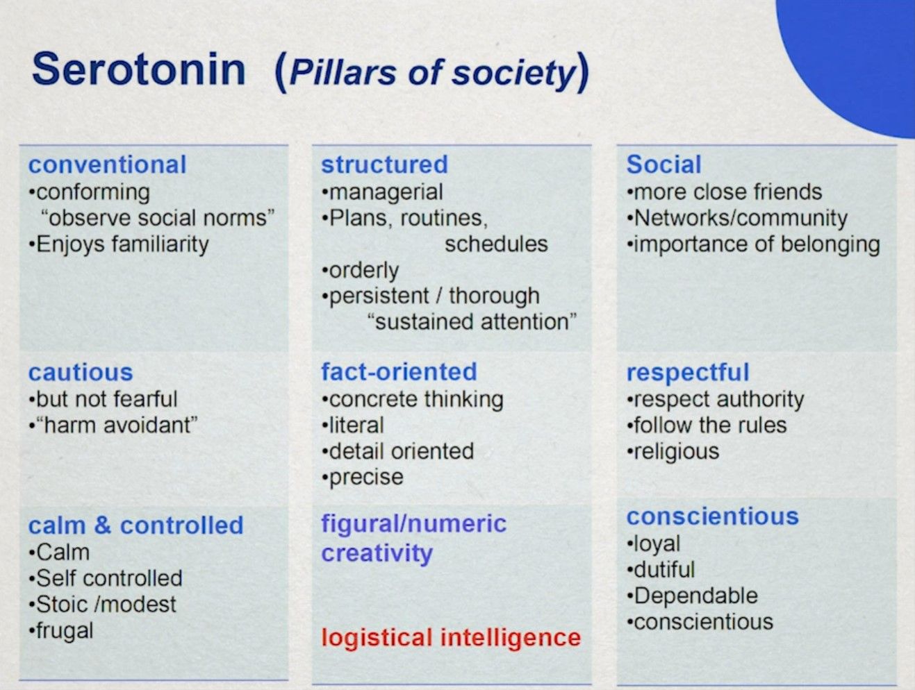 如果你是血清素系统反应活跃的建造者,那么你更倾向于是一个传统的人,尊崇社会规范、从众。这类人的大脑扫描显示他们更喜欢熟悉的事物。他们不对陌生的事物害怕但会小心谨慎,从容应对。(事实上,像百忧解(prozac)和帕罗西汀(paxil)这样的药物就是激活血清素系统来让人冷静下来的。)他们遵守规则、尊重权威,喜欢计划和规划,更倾向不夸张的具体思考,对数字计算很擅长。宗教也很受血清素系统影响。有趣的是,通过问卷发现,相较其他三类人,建造者是唯一无法容忍不忠诚的朋友(相较无趣的朋友,为其他三类人所不能容忍)的人。在世界范围来看,血清素系统(社会规范和服从)相关基因出现最普遍的地区是中国和日本。典型的例子有Mike Pence、中国前任国家主席、Mitt Romney等。