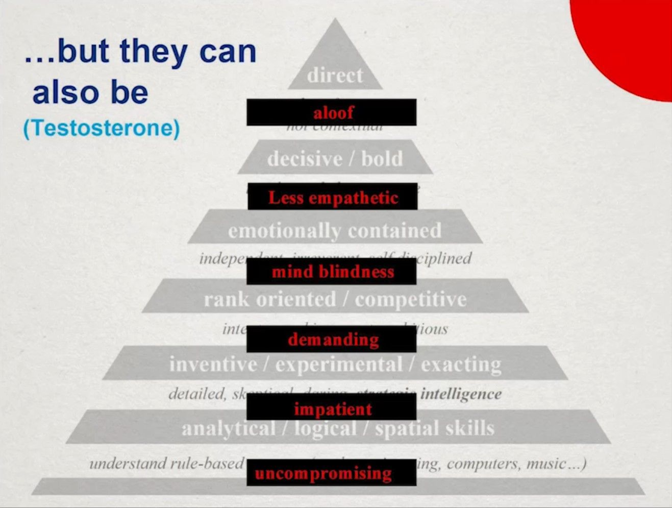 如果你是睾酮系统反应活跃的执行者,那么你很可能会擅长构建基于规则的系统。这类人对计算机、工程、数学、音乐非常擅长。他们倾向于富有创造性、严谨苛求、好斗。(如果你把睾酮注射给几只鸽子或者蜥蜴,那么他们会开始打斗来争取更高的地位。)他们情绪内敛、果断、大胆、直奔主题。典型的例子有Margaret Thatcher、Steve Jobs、Hilary Clinton、Donald Trump等。