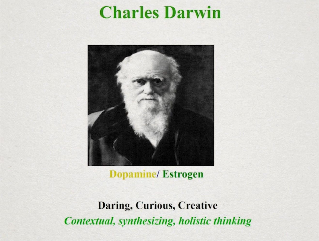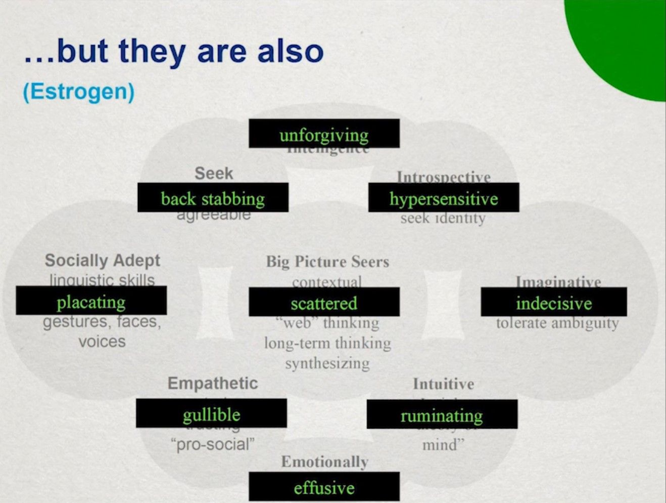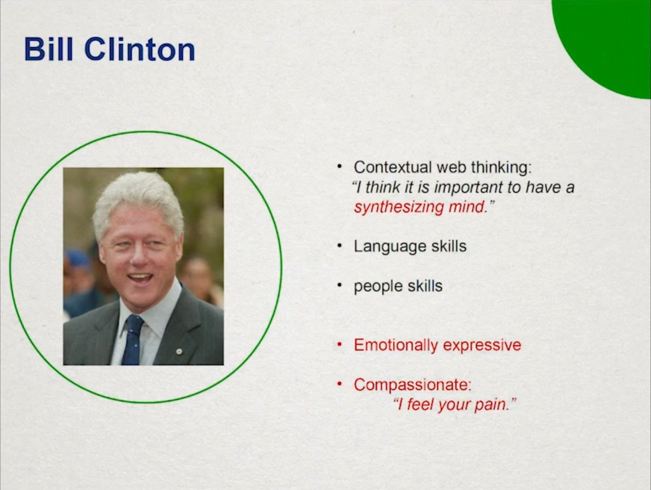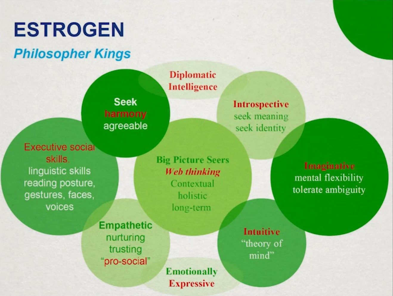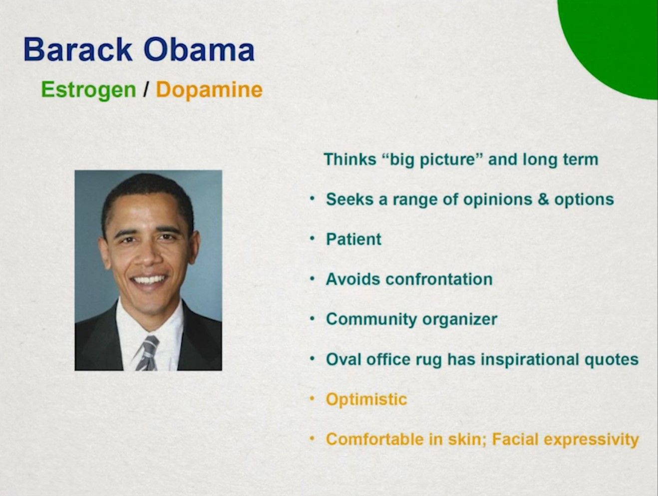 如果你是雌激素系统反应活跃的谈判者,那么你拥有网络思维(web thinking,因为你的大脑在子宫内构建时拥有更丰富的神经连接)。这类人富于想象,女性占更大的比例——而网状思维给了女性在现代商业世界巨大的优势。他们拥有给力的社交技能,可以很容易阅读别人的肢体语言和声调变化。他们拥有直觉并能轻易看穿人的思想,以此说出你需要听的内容。他们待人春风拂面,能很好地建立信任。(站在演化的角度,信任可以节省大量的能量;可以看到识人和信任同时存在于谈判者的身上,是一起进化出来的,盲目的信任是很危险的。)他们更倾向于内省,但也同时看向外部。他们寻求和谐并且善于表达情绪。典型的例子有Barack Obama、Bill Clinton、Charles Darwin、Oprah Winfrey等。